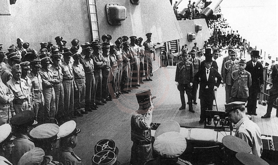 1945年9月2日,泊于东京湾的美国战舰密苏里号上,在包括中国在内的9个受降国代表注视下,日本在投降书上签字。新华社发