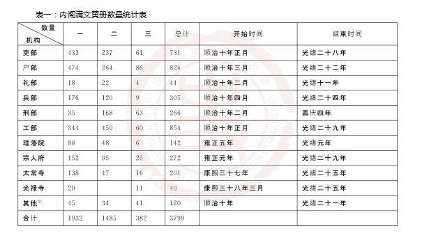 ⑦包括都察院黄册9册,内容为造报监察御史条陈事件;国子监黄册3册,内容为造报进出钱粮数目;地方上报黄册60余册,主要是黑龙江、江宁、青州等将军谨题修造般支用过各种材料或用过勘合火牌数目册及各省巡抚题绿营官兵俸薪饷银开支数目册;无法判定机构朝年的黄册残件40余册。