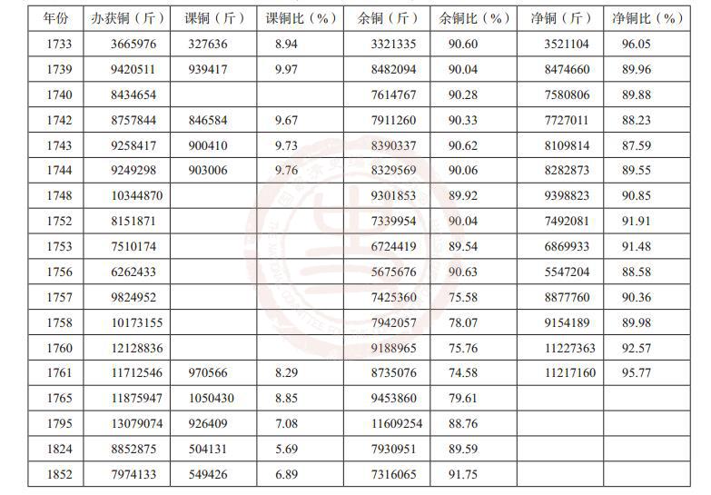 ×90%×6%)÷100}×9.2。根据清代云南历年官府办铜数量b,推算铜课变价银序列见后表。