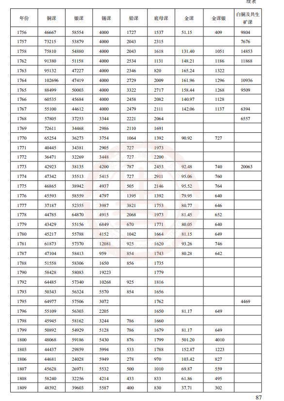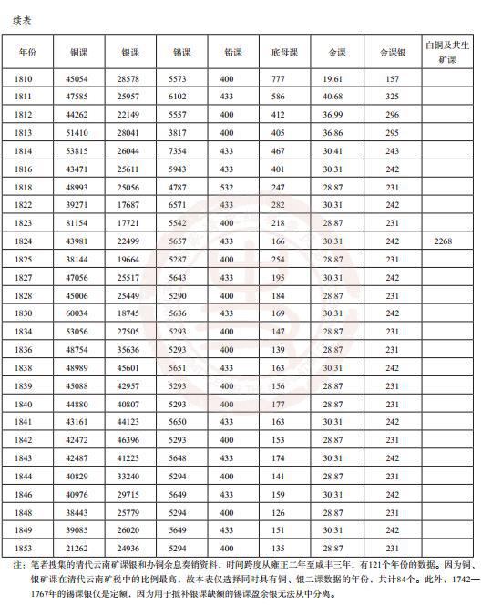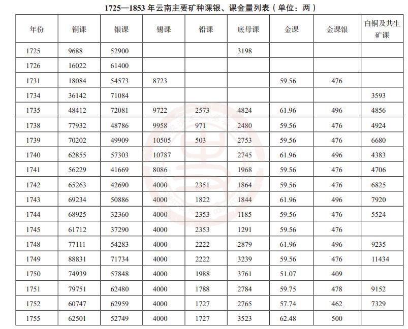 但是,矿产量处于变化之中,当矿厂旺盛之际,定额矿课易于完成,而当矿厂衰落之时,往往征不足额。上述明直厂“矿苗断绝”,无从征课,但每年额征 330 两矿课银从赋役全书中 “除豁”之前,仍需管厂官员赔补。因此,定额矿课仅能反映确定额度当年的实征矿税量。康熙时期,云南曾经两次确定矿课额度:一是康熙二十四年云贵总督蔡毓荣题定,年征课金 74.08 两,银铜铁锡朱砂课银 81815.63 两;二为康熙四十四至四十六年云贵总督贝和诺题定,年征课金 59.56 两,银铜铁锡朱砂课银 76152.07 两g。