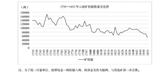 综上所论,清代云南矿税银处于不断变化之中,经历了从快速增加到缓慢下降的过程,从康熙二十四年至乾隆十四年(1685-1749),全省矿税银在波动中快速增加,从 8 万余两增至 18 万余两,这种变化与滇铜产量快速扩大密不可分;乾隆十五年至咸丰三年(1750—1853),全省矿税银在波动中缓慢下降,从 18 万余两降至 2 万余两,这主要是银、铜矿业相继衰落所导致。虽然清代云南矿税制度纷繁复杂,定额与实征相互交织,而战争、矿业政策、征课制度亦对矿税有不同程度的影响,但是,矿产量的波动才是矿税变化的决定性因素。