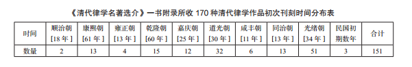 何秋涛的律学研究并非个例,从整体上看,嘉道以降的经世思潮,对于律学研究的生长提供了培植的沃土,这一点在律学作品的数量上有突出体现。张晋藩主编《清代律学名著选介》一书附录《律学简介总表》,d该表对律学作品及作者均有简要整理与介绍,且附带说明作品版本,该表收录 170 种律学作品,虽较该书最末的《附录书目》中开列的 428 种,在数量上为少,但《律学简介总表》信息更为详实,且代表性更强,兹以此 170 种清代律学书目为统计对象,以分析律学作品在清代各朝的数量分布情形。需要说明的是,这 170 种书并非 170 本,其中有汇集丛刊的情况,这种情况只算为一种;作品归属于哪一个朝代,以刻本或抄本的年代为准,且大多数以初次刊刻的时间为率,因为其中有一些书被不同的机构刊刻或前后多次刊刷,有的书出版时间情况相对复杂,笔者对各书出版的时间均作了初步的辨别和考量。存在这种情形,即有的作品是由主要活动于乾隆朝的人所撰写,但到光绪年间才刊出,这种情形笔者归入光绪朝即作品刊刻的朝代中。这 170 种书,时间不详者有 8 种;《大清律例》文本和《三流道里表》和《五军道里表》等计有 5 种,此类应当刨开不计;此外,虽是清人所作,但并非讨论清代的律学问题,而是对汉律或宋元明法制,或是清之前状况的作品,计有 6 种,亦不计算在内。